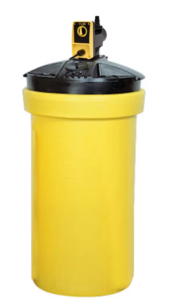 No todos los procesos requieren un sistema automatizado. Para aplicaciones más simples, ofrecemos un sistema de dosificación de químicos compacto, que incluye: Tanque para almacenamiento del químico, bomba dosificadora LMI y accesorios básicos de conexión (Griffco)